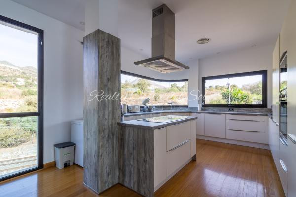 The spacious dining room is connected to the open-plan and modern deluxe kitchen integrates seamlessly with the rest of the house. It's equipped like a chef's dream kitchen, with plentiful space for food prep, cooking, serving and has a nice island in the centre and stunning views to the mountain. The latest appliances and hi-gloss cabinetry add to the designer vibe.