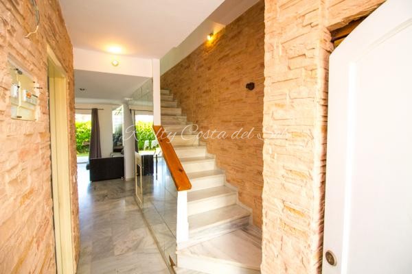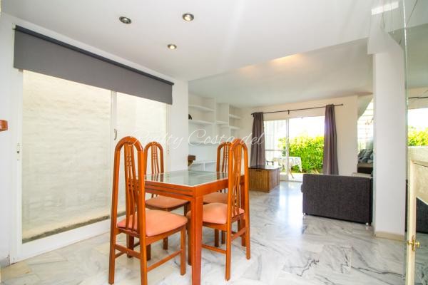 AMPLIO ADOSADO A ESCASOS METROS DE LA PLAYA EN ZONA CON TODO TIPO DE SERVICIOS Distribución: hall de entrada, aseo de invitados, cocina amueblada con barra americana, gran salón comedor con chimenea con patio interior que provee de luz y adaptado para ventilación de la planta sótano (posibilidad de apartamento completo en sotano), porche cubierto y jardín de 50m2 aprox. PLANTA ALTA: 2 dormitorios (el principal con terraza y vistas al mar) con amplios con armarios empotrados y baño con ventilación natural. Parking privado cerrado frente a la vivienda, ademas de aparcamiento en la misma puerta de la vivienda, espectacular zona de comunitaria con piscina, amplias zonas verdes, sauna y parque infantil. Con todo tipo de servicios caminando: restaurantes, supermercado, farmacia, clínica veterinaria, parada de autobús, taxi... y a 300 metros de la playa.
